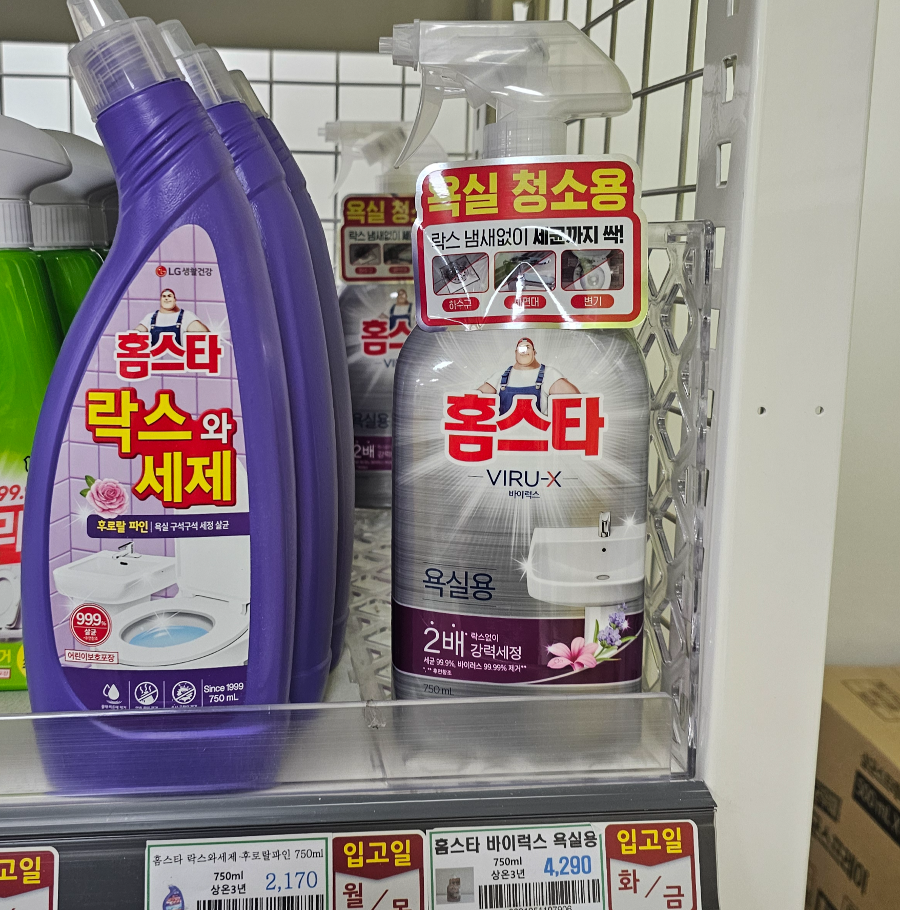 홈스타 후로랄파인 향이 좋아서 락스청소하는데 락스냄새 안나서 좋더라구요 가격도 대용량인데 2천원이면 어찌보면 용량대비 제일 저렴한제품같아요 강추템입니다. 욕실 곰팡이가 아주 심한분들은 옆에 바이럭스 제품 추천해요. 저거 한번쓰면 한달간은 곰팡이 안생기더라구요 ! 하수구, 세면대, 변기까지 올킬입니다.
