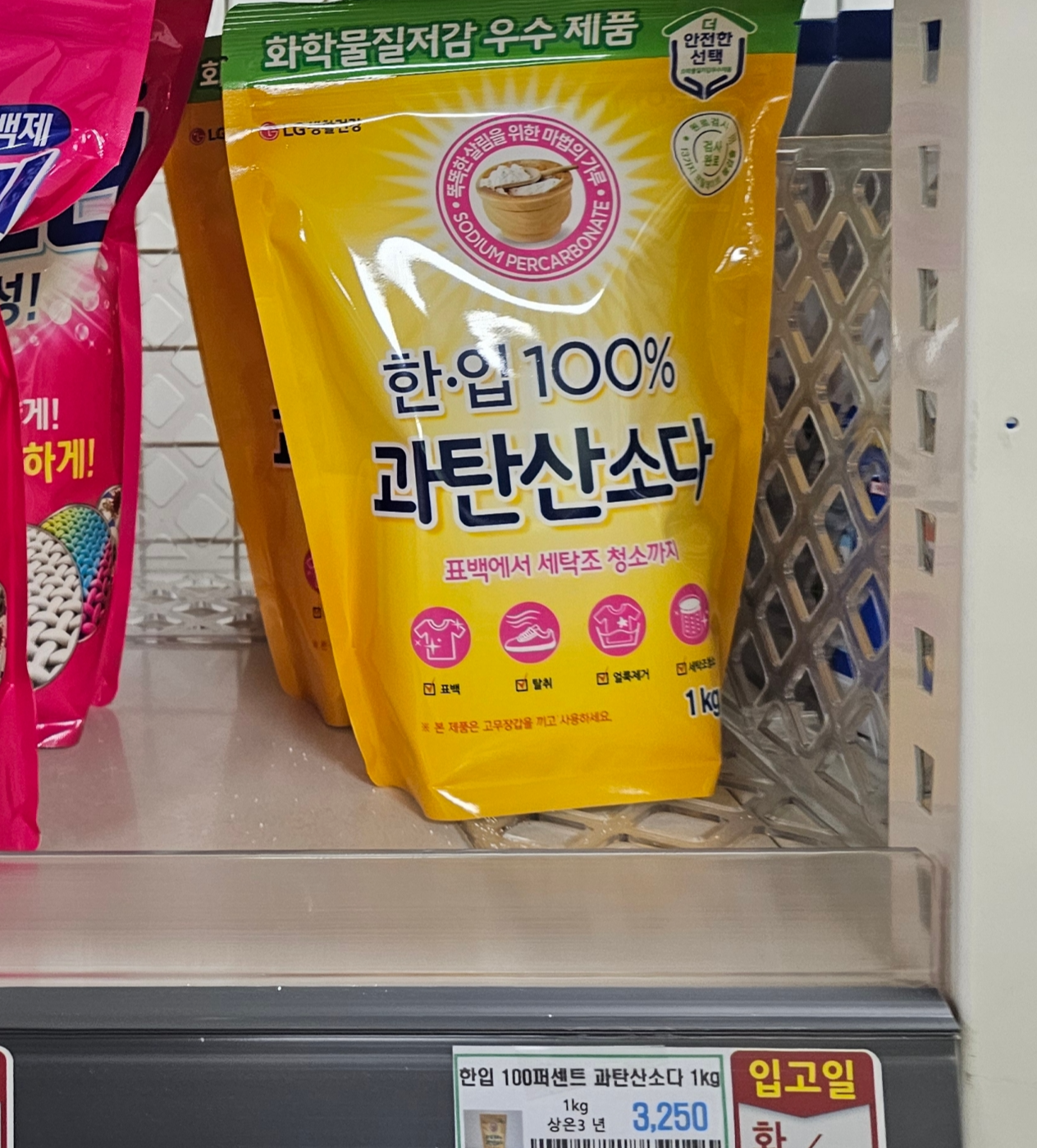 누렇게 변한 베개피나 목 뒤의 누런 얼룩없앨땐 과탄산소다만한게 없어요. 세탁할때 넣어서 세탁해도 좋지만 저는 뿌려놓고 담가두었다가 세탁하면 진짜 때가 잘 지워져서 좋더라구요. 일반세제로는 누런때 절대 안빠지던데말이죠! 무엇보다 가격이 진짜 저렴해요. 다이소보다도 훨씬 저렴하니까 무조건 담아보세요