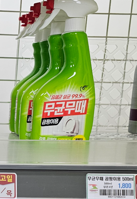 저는 저 초록색 무균무때는 갈때마다 무조건 사온답니다. 1,800원이라니 말도 안되는 가격이죠! 욕실청소할때 저거하나만있으면 끝이에요. 곰팡이 싹 지워지고 완전 군마트 욕실세제 추천템입니다.