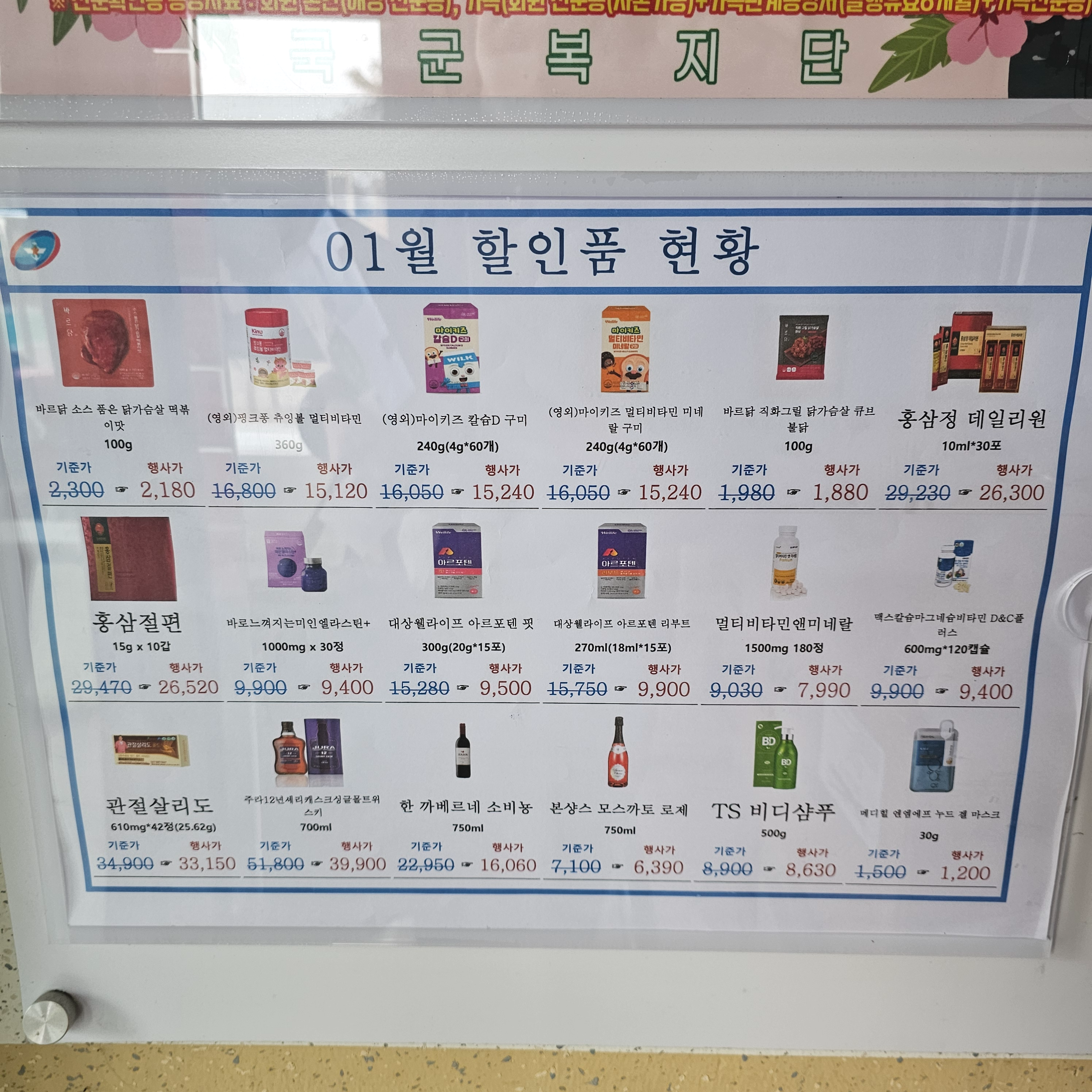 군마트는 할인이 필요없을만큼 저렴한 가격이지만, 추가할인을 해줄때가 있는거 알고계셨나요? 이번에 다녀온 영외마트에 1월 할인품이 안내되어있길래 따끈따근한 소식 전달드리려고해요. 1월 한달동안만 할인가에 구매할 수 있으니 얼른 다녀오셔야 한답니다. 1월 할인품은 영양제와 주류, 샴푸, 마스크팩, 닭가슴살 등 제법 다양한 제품이 있습니다. 자, 바로 확인해 보시죠!