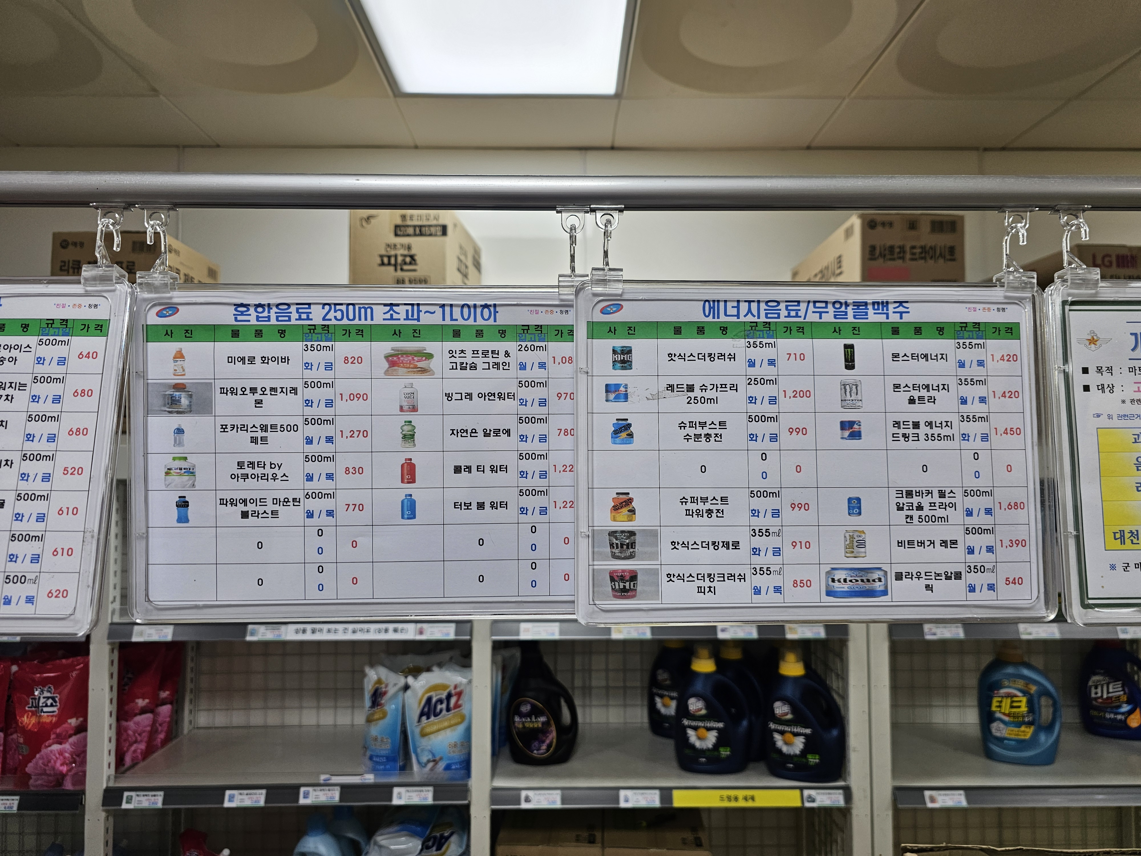 솔직히 군마트 갈 때마다 음료 코너가 제일 고민이죠! 종류가 너무 많기도 하구요~ 이번엔 제가 가격표를 전부 찍어와서 탄산/혼합/과채/액상차/에너지까지 PX 음료를 한 번에 비교할 수 있답니다! 1.5L 대용량부터 250ml 캔, 단백질·제로·무알콜맥주까지 최신가로 정리했으니, 장보기 전에 저장해두고 미리 준비해보세요:-)