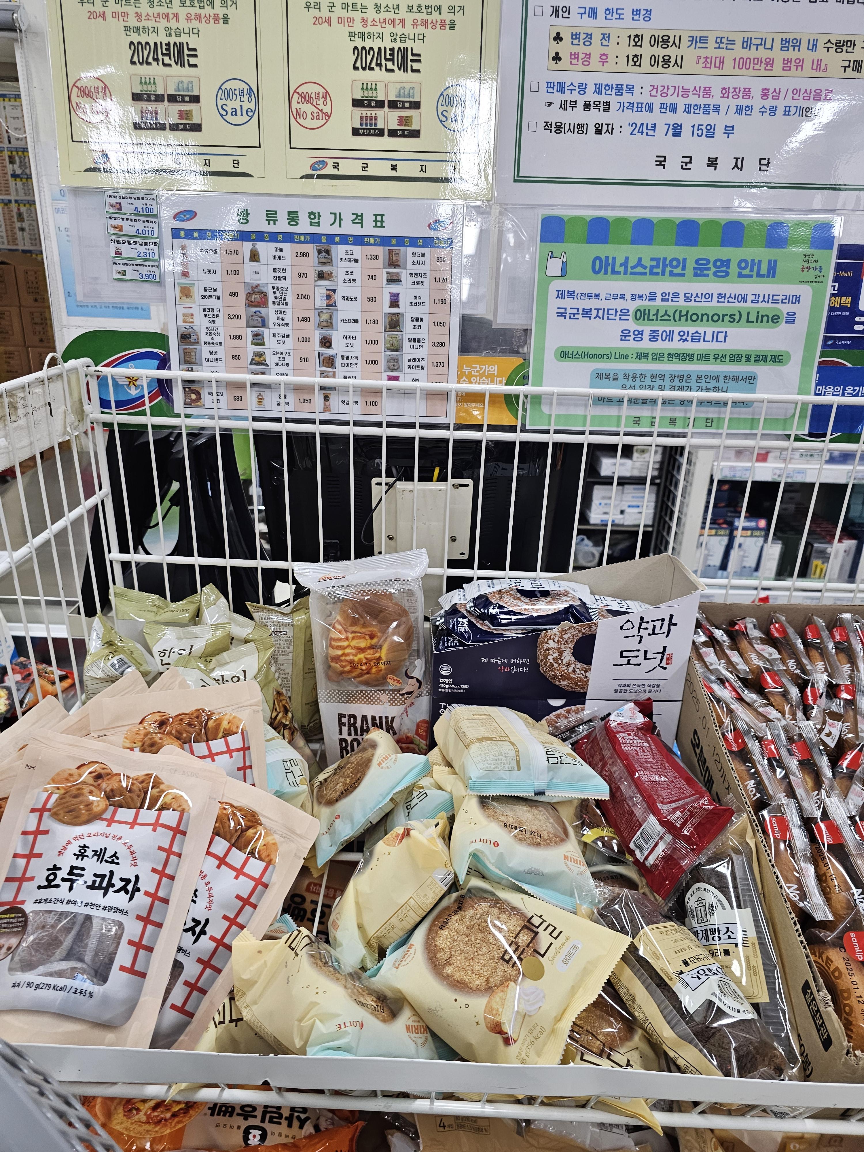 군마트 빵종류는 대형마트에서 보던 빵종류가 전부 준비되어있어서 미리 가격 보시고 편안하게 쇼핑준비 하시면 좋을 듯 합니다. 겨울이다보니 호빵 소비가 많을것으로 예상되며, 입고일은 보통 월/목 인 경우가 많고 오전에 가시는게 좋습니다.