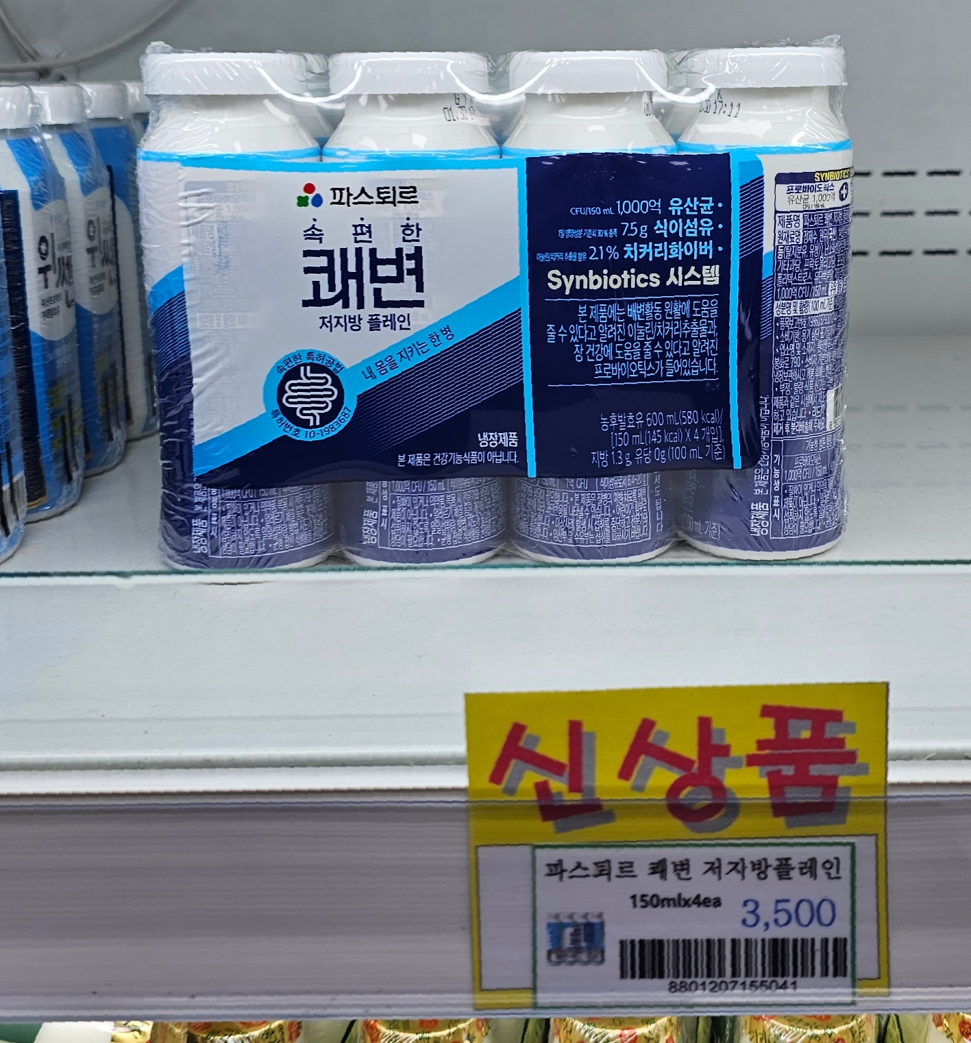 요즘 대세답게 칼로리를 신경쓴 저지방 쾌변이 나왔어요. 쾌변 드시는분들은 또 이것만 드시더라구요. 유산균이 1,000억마리 들어서 변비에 좋은것같아요. 대형마트에서 6천원정도 하는 제품인데 가격좋네요! 확실히 이런건 군마트에서 사야되는것같아요.